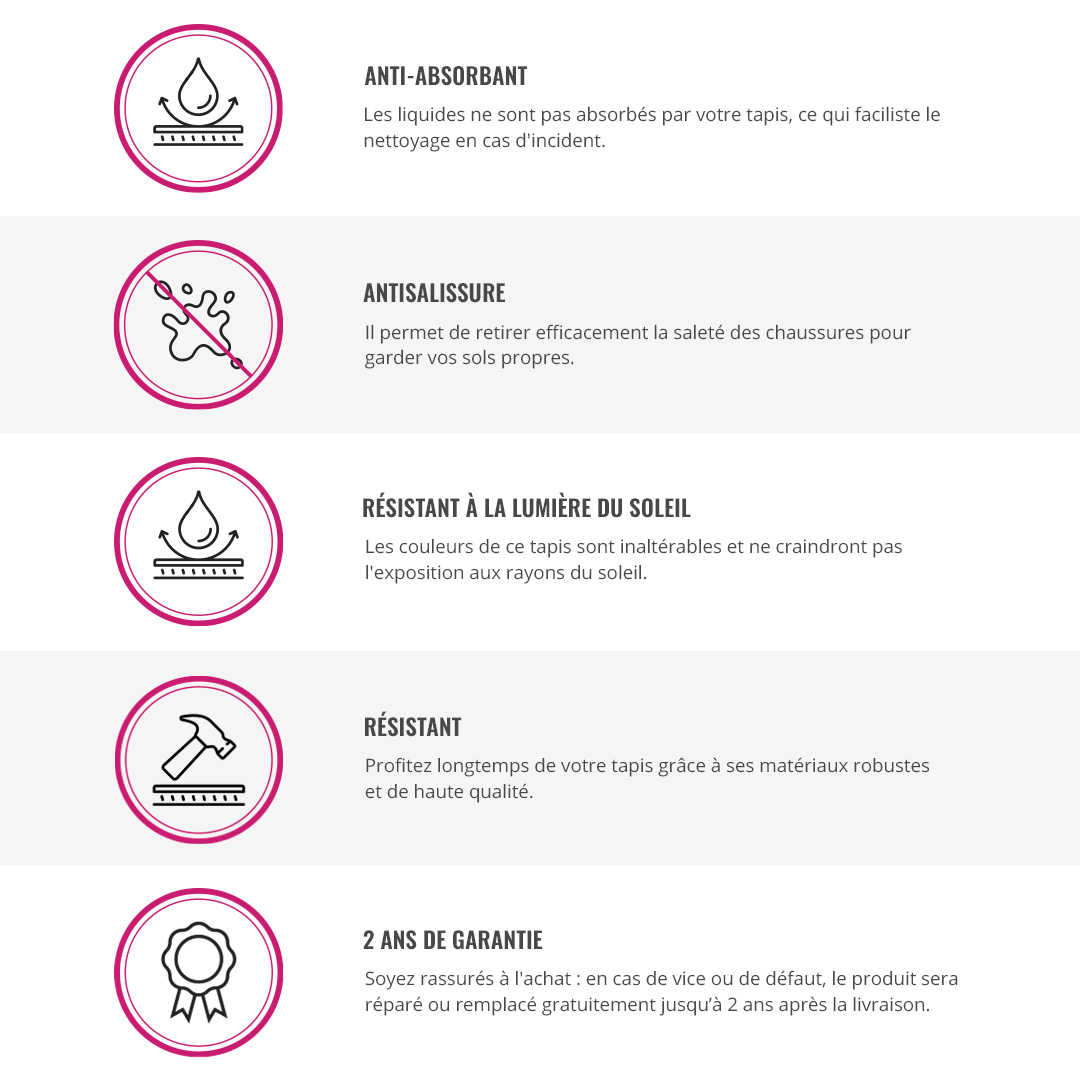 Profitez longtemps de votre tapis grâce à ses matériaux robustes et de haute qualité.