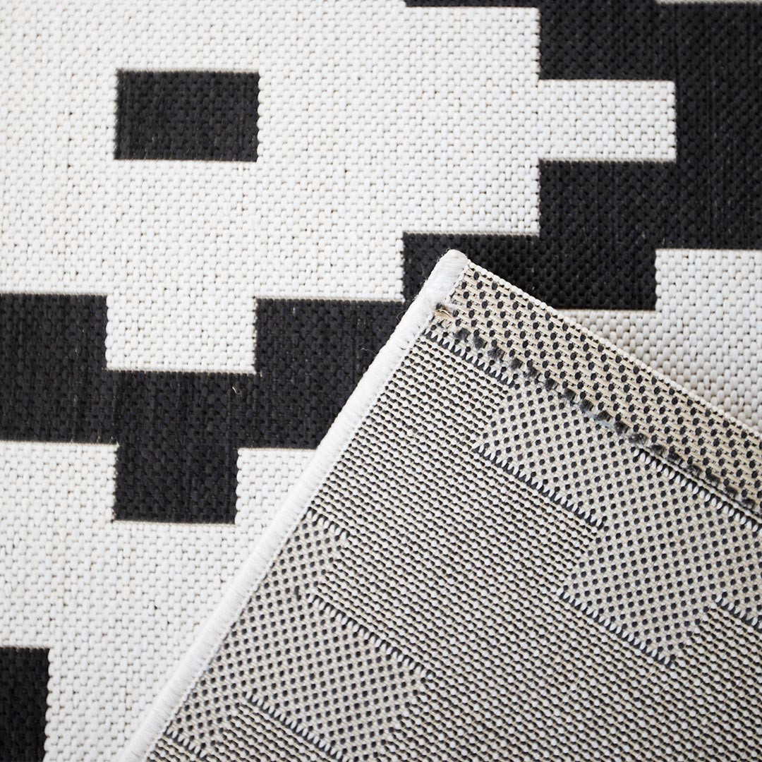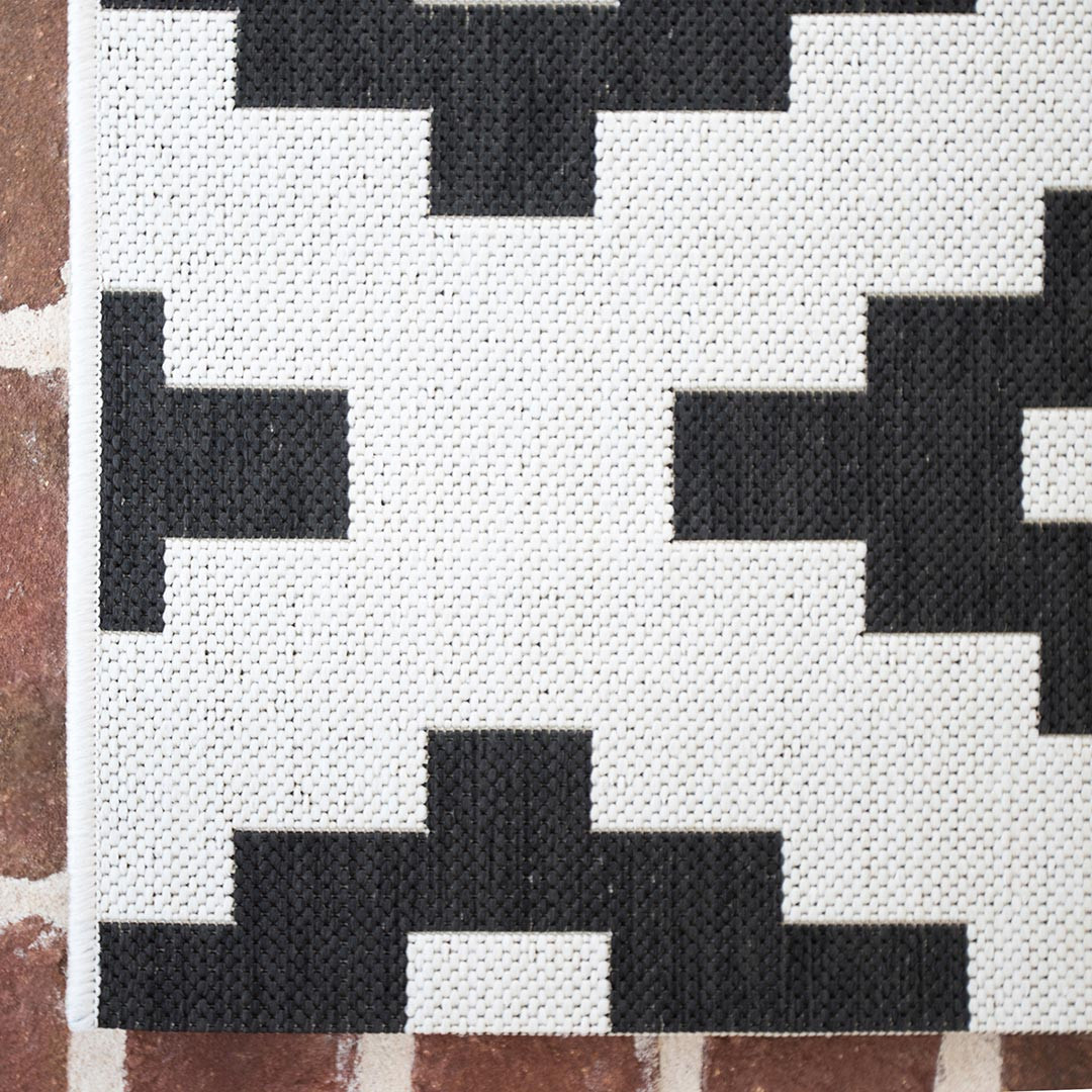 Le tapis intérieur et extérieur scandinave plat belgrade se démarque par son design rectangulaire et une couleur crème, ponctué de motifs géométriques en forme de losanges noirs. Cette combinaison entre le noir et une couleur plus douce crée un contraste visuel qui attire immédiatement l'attention. Les motifs géométriques apportent une touche contemporaine à cet accessoire de décoration. Ce tapis peut s'intégrer harmonieusement dans un intérieur moderne, où son design géométrique apporte une dimension artistique et épurée. Il est également le complément idéal pour une ambiance scandinave.