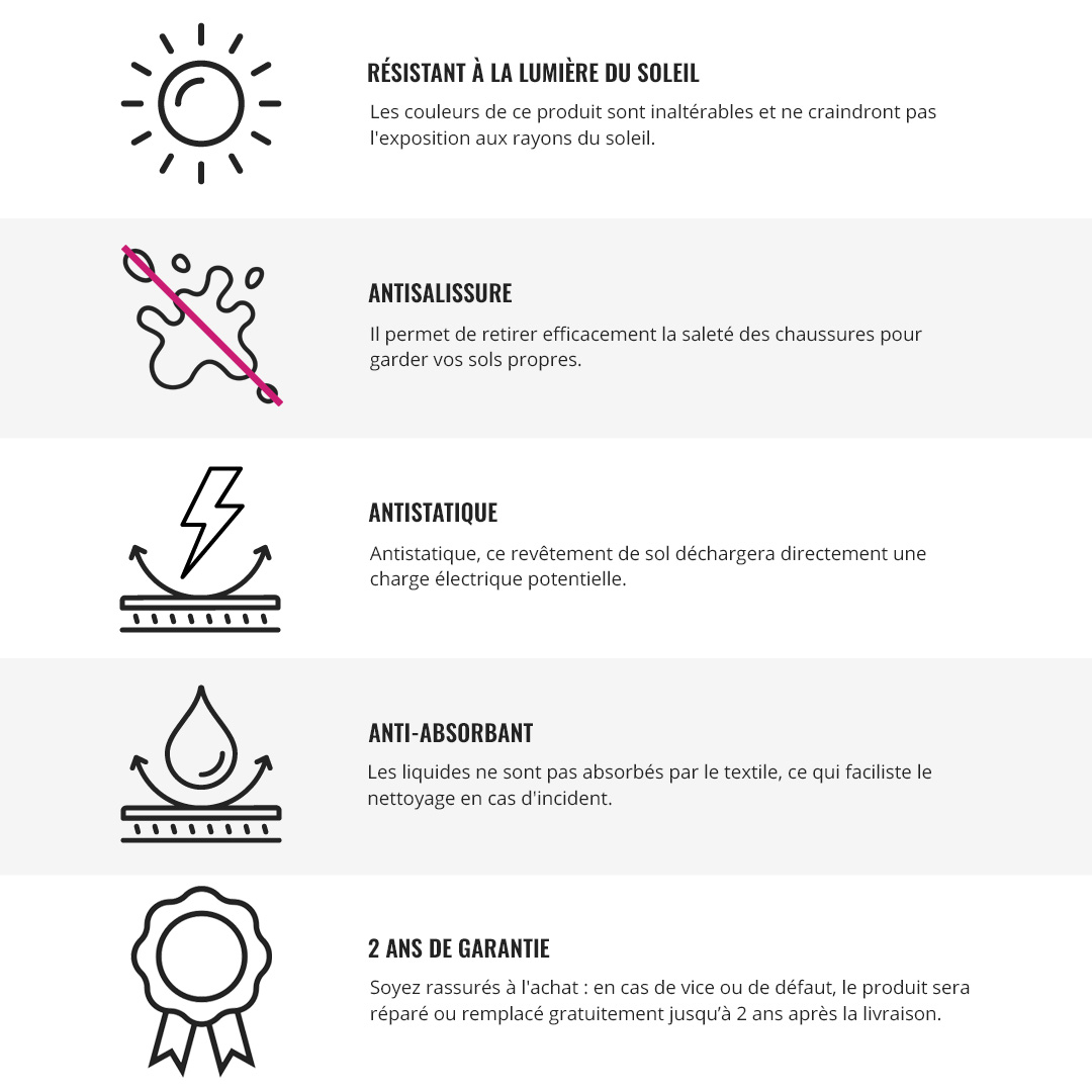 Il s'agit d'un revêtement antidérapant et très résistant. Il ne cède pas à l’usure et conserve aussi sa couleur dans le temps. En effet, ce tapis moderne pour sol est fabriqué selon les exigences en termes de stabilité à la lumière. Ainsi, ses couleurs ne s’altèrent pas même s’il est exposé aux rayons solaires.